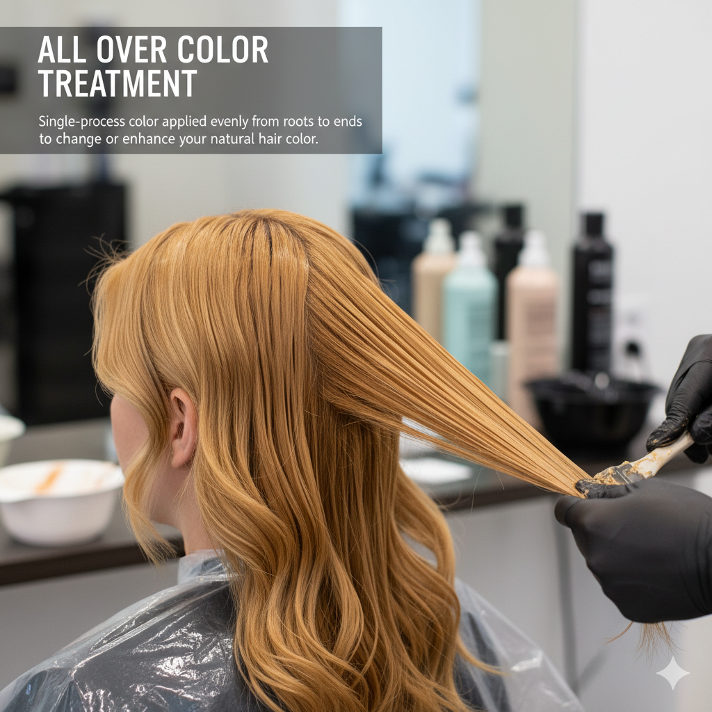 A root-touch color service that covers regrowth, blends grays, and maintains a consistent, vibrant shade from roots to ends.